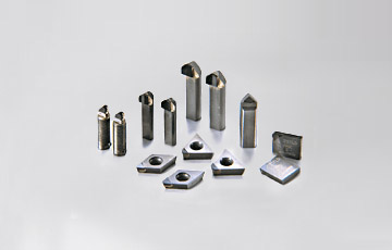 多結晶焼結体 一覧 多結晶燃結体 ダイヤモンド焼結体(PCD)はダイヤモンドの耐摩耗性と超硬合金の強度と靭性を併せ持っています。 天然ダイヤモンドの様に結晶方向によるバラツキがない為、長時間安定した性能を発揮します。表面粗さは天然ダイヤモンドに比較し劣ります。 CBNの超微粒子を焼結したCBN焼結体(PCBN)は焼入れ鋼、チルド鋳鉄、耐熱合金などに用いられ速い切削速度と長い工具寿命を特長としています。